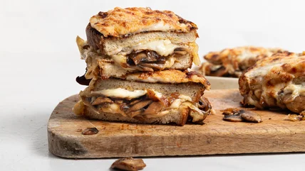 Filled with cheese and topped with béchamel, this sandwich has all the gooey comfort of a French croque monsieur, but with earthy mushrooms instead of ham.